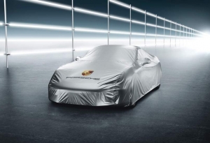 Perfect-fit outdoor vehicle cover made from water-repellent material. With full-color Porsche Crest and logo. Including anti-theft protection